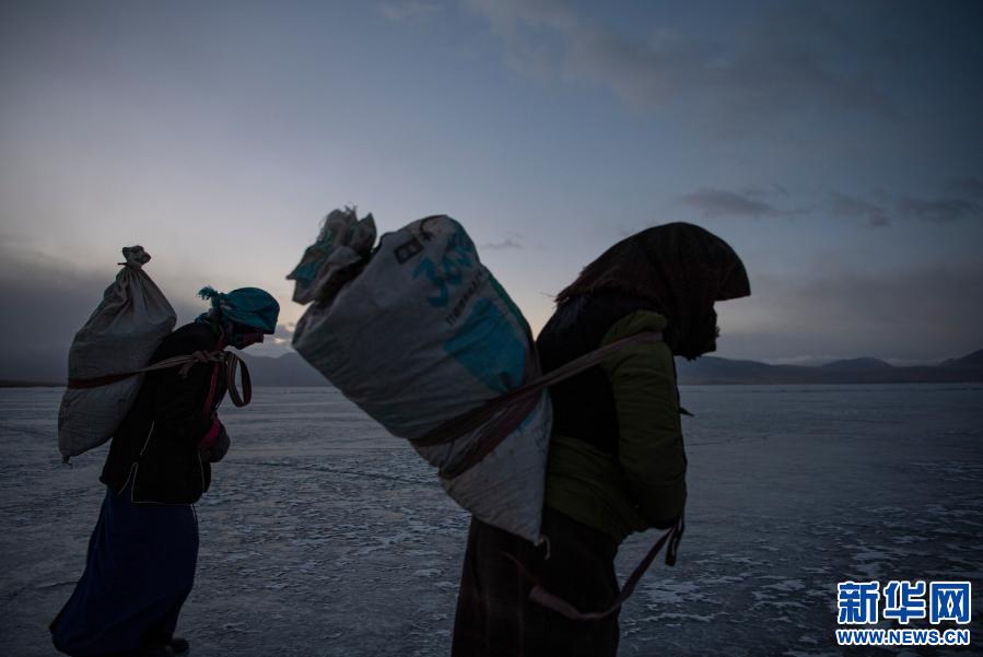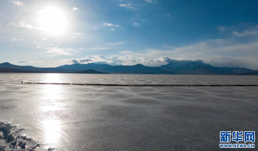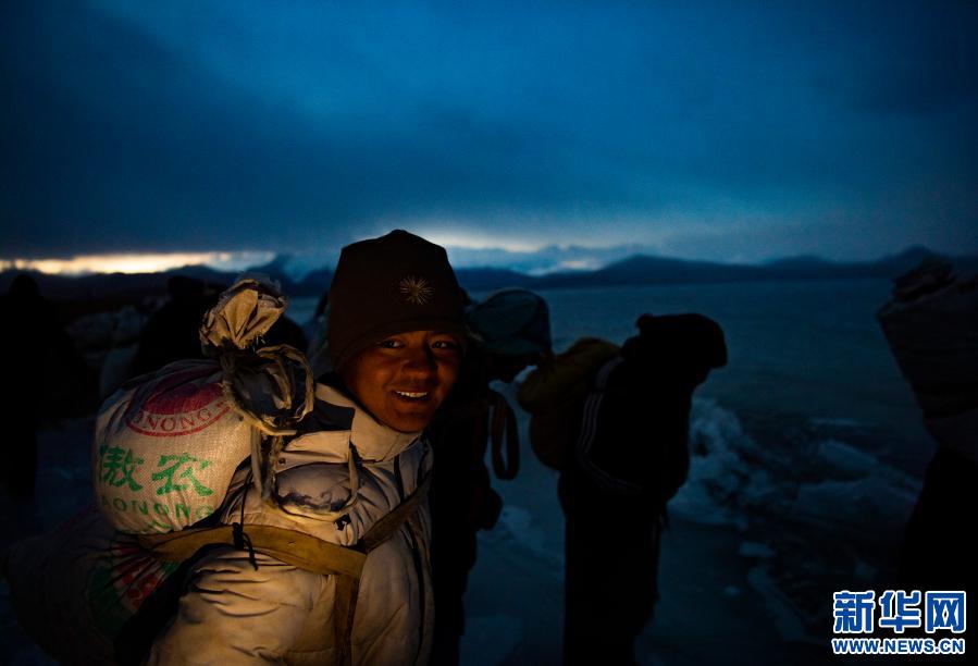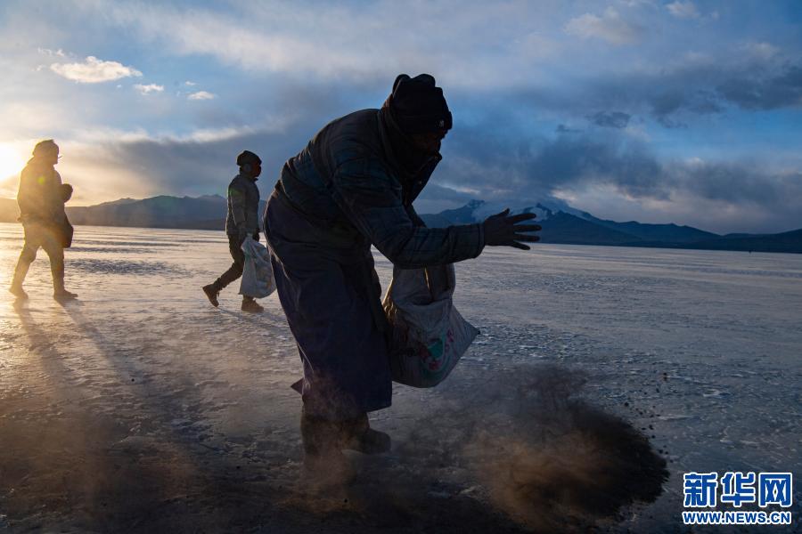 西藏山南市浪卡子縣堆瓦村的村民清晨背著牛糞爐灰來(lái)到普莫雍錯(cuò)湖邊,準(zhǔn)備修通安全小路(3月6日攝)。新華社記者 孫非 攝
