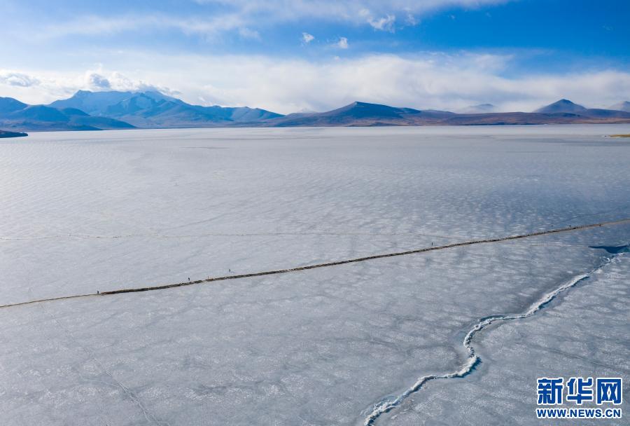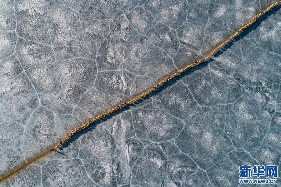 羊群順著安全小路通過(guò)普莫雍錯(cuò)冰湖(3月6日攝,無(wú)人機(jī)照片)。新華社記者 晉美多吉 攝