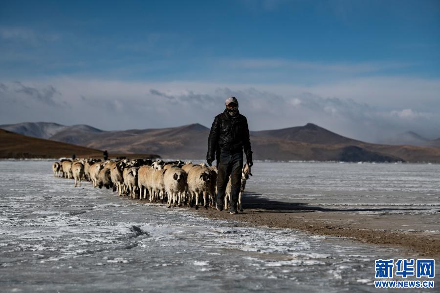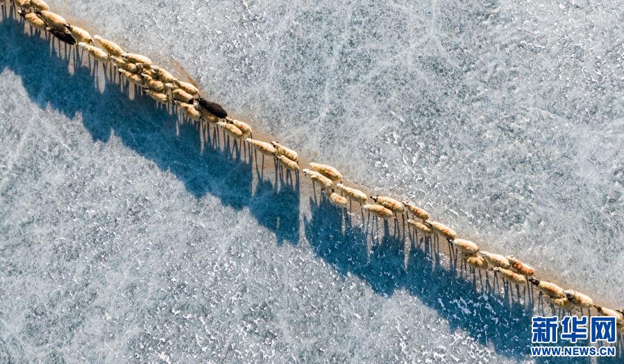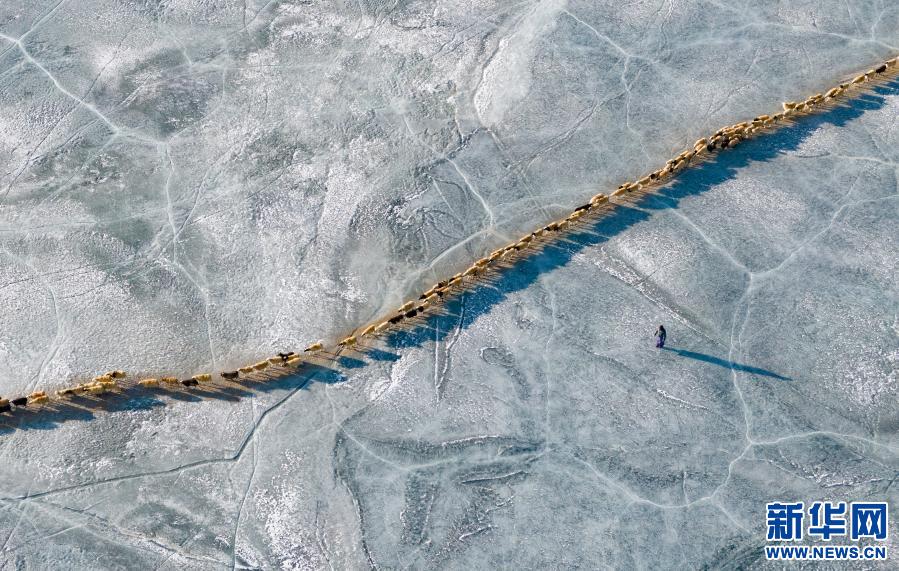 牧羊人趕著羊群,太陽(yáng)趕著牧羊人。不停向前的羊群在冰湖上拉出長(zhǎng)長(zhǎng)的隊(duì)形。