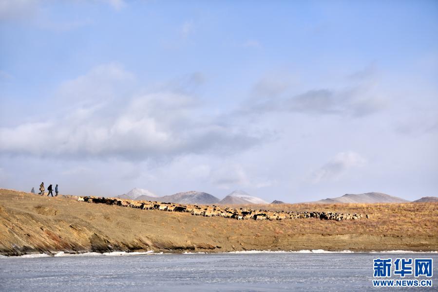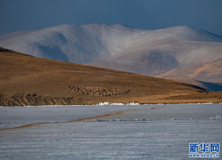 羊群在普莫雍錯(cuò)湖心島上準(zhǔn)備出發(fā)(3月6日攝)。新華社記者 普布扎西 攝