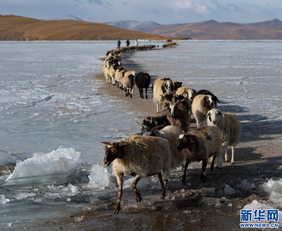 羊群順著安全小路通過(guò)普莫雍錯(cuò)冰湖(3月6日攝)。新華社記者 孫瑞博 攝
