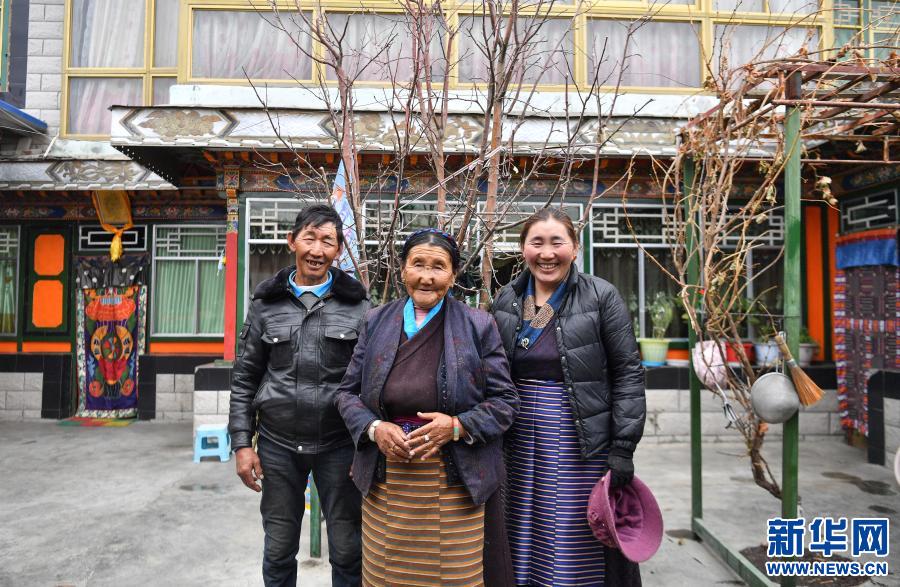 達娃(中)和女兒、兒子在自己的藏式院落前合影(3月15日攝)。新華社記者 晉美多吉 攝