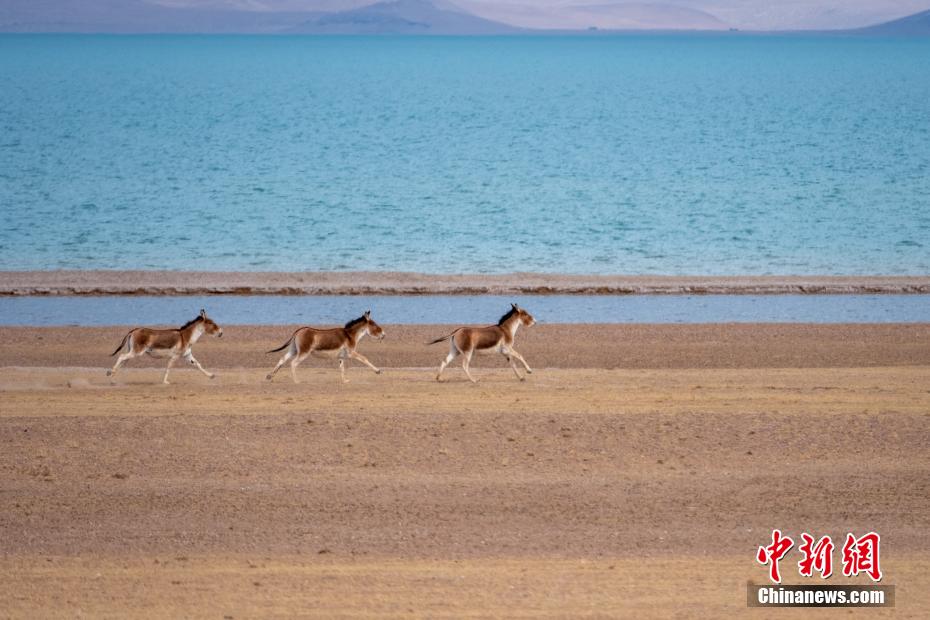 圖為5月2日,西藏色林錯湖邊三頭藏野驢在撒歡奔跑。江飛波 攝