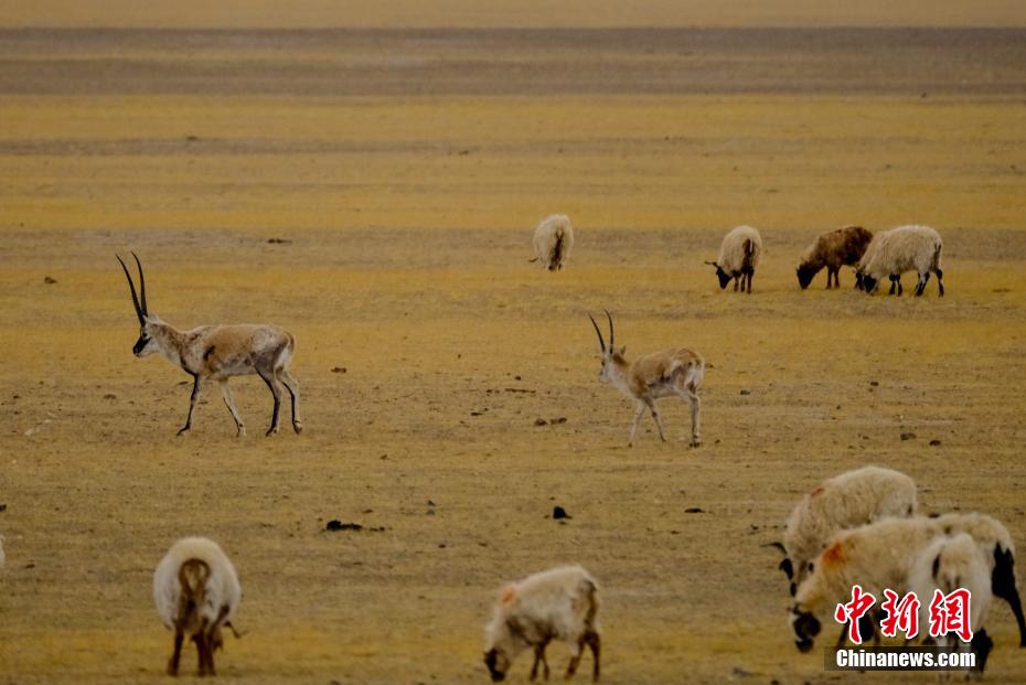 圖為兩只藏羚羊混入牧民羊群中一起覓食。江飛波 攝