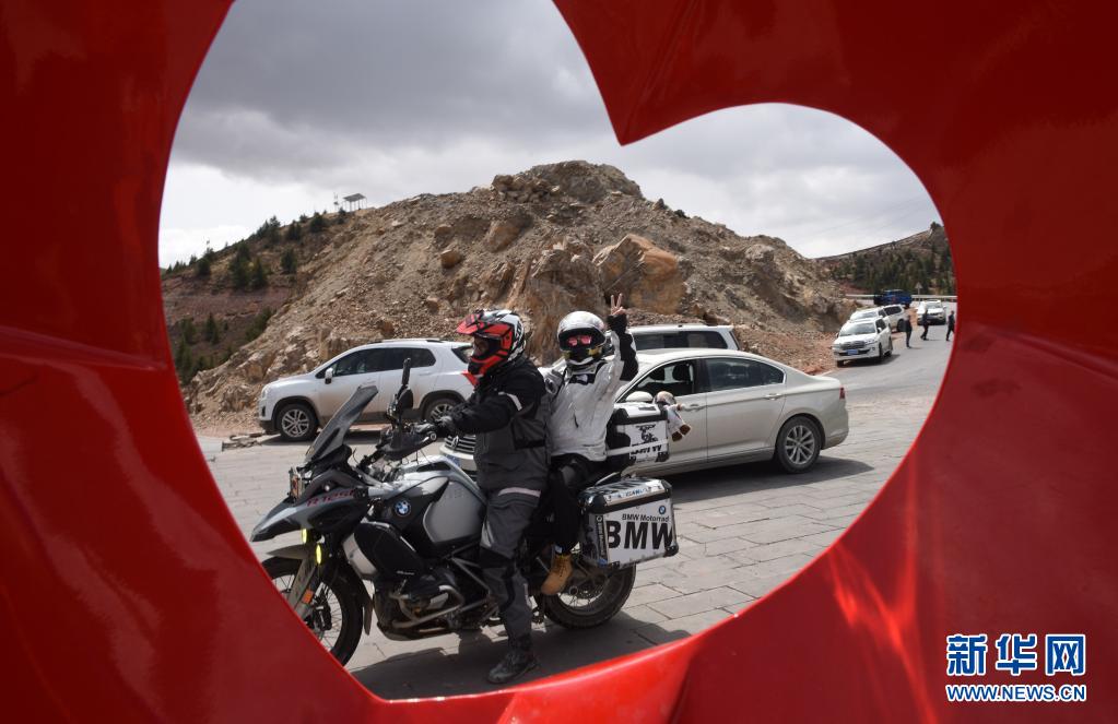 在西藏芒康縣拉烏山,一對騎行摩托的年輕人準(zhǔn)備出發(fā)(5月2日攝)。新華社記者 陳燮 攝