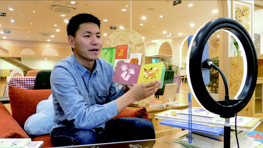 扎次通過直播講繪本故事(4月1日攝)。新華社記者旦增尼瑪曲珠攝