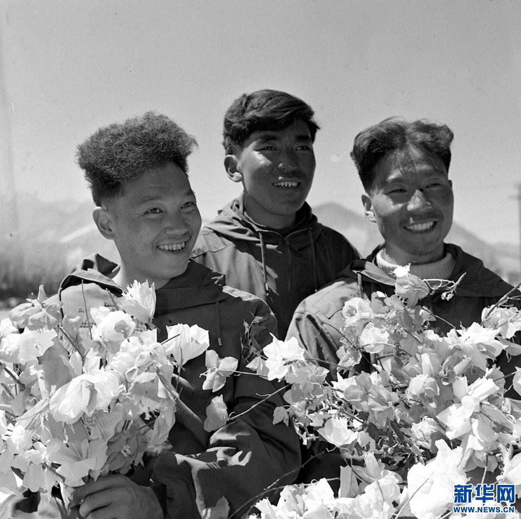 圖為登上珠穆朗瑪峰頂峰的三名登山英雄。右起:王富洲、貢布(藏族)、屈銀華。陳珺攝(新華社稿)