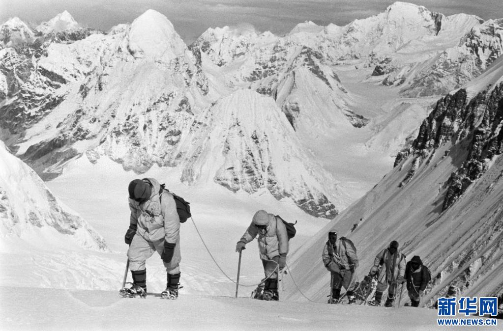 照片拍攝于1960年5月,中國(guó)登山隊(duì)隊(duì)員在海拔7150米的冰雪坡上行進(jìn)。新華社發(fā)