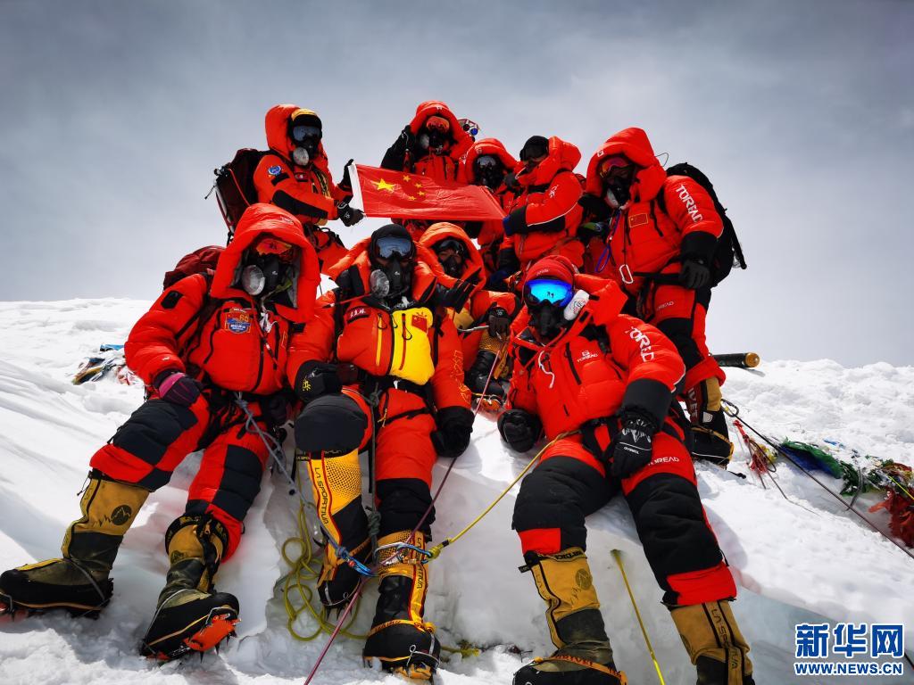 2020年5月27日,2020珠峰高程測(cè)量登山隊(duì)在峰頂合影留念。新華社特約記者扎西次仁攝