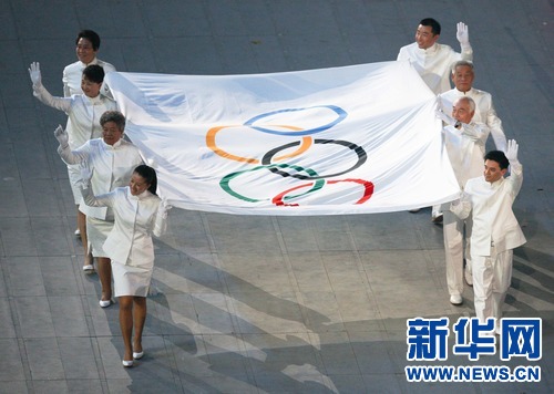 2008年8月8日,中國(guó)首位珠峰北坡登頂?shù)呐巧郊遗硕啵ㄗ筮厪那皵?shù)第二位)在北京奧運(yùn)會(huì)開(kāi)幕式上,手執(zhí)奧林匹克會(huì)旗入場(chǎng)。新華社發(fā)