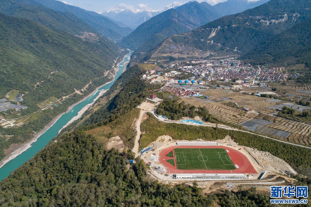 墨脫縣新建的11人制足球場(chǎng)位于雅魯藏布江邊(無(wú)人機(jī)照片)。新華社記者孫非攝
