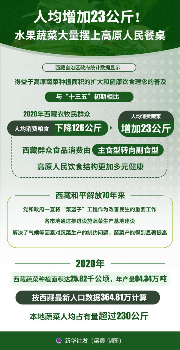 西藏自治區(qū)政府統(tǒng)計數(shù)據(jù)顯示,得益于高原蔬菜種植面積的擴(kuò)大和健康飲食理念的普及,與“十三五”初期相比,2020年西藏農(nóng)牧民群眾人均消費糧食下降126公斤,人均消費蔬菜增加23公斤,西藏群眾食品消費由主食型轉(zhuǎn)向副食型,高原人民飲食結(jié)構(gòu)更加多元健康。