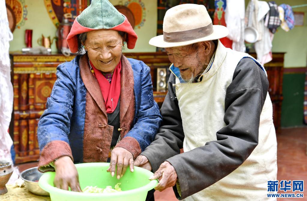 索朗(右)和老伴窮阿洗菜(4月16日攝)。新華社記者 張汝鋒 攝