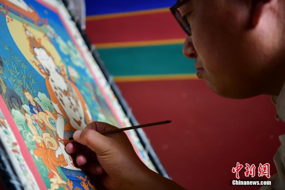 6月12日,2021年“文化和自然遺產(chǎn)日”西藏非遺展演展示系列活動在拉薩舉行?;顒蝇F(xiàn)場融入了文藝演出、非遺展演、非遺產(chǎn)品展銷等內(nèi)容,市民游客可親身體驗非遺產(chǎn)品的制作過程。圖為非遺傳承人在手繪唐卡?!?中新社記者 貢嘎來松 攝