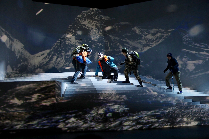 舞臺上,話劇《種子天堂》劇情進(jìn)入最高潮——在缺氧、強風(fēng)惡劣環(huán)境下,鐘揚拼盡氣力來到海拔6000米的高度。當(dāng)他終于在一堆雜草和冰雪中發(fā)現(xiàn)那株頑強的雪蓮時,就像父親看到自己剛出生的嬰兒,臉上掛著深深的喜悅,凝望良久……