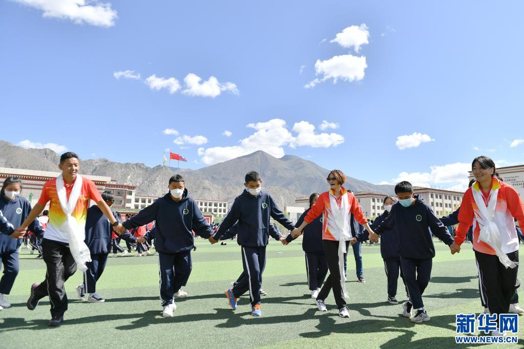 6月25日,跳水奧運(yùn)冠軍高敏(前右三),西藏和平解放以來首個(gè)競(jìng)技體育世界冠軍、摔跤運(yùn)動(dòng)員西洛卓瑪(前右一)和成功登頂七大洲最高峰并徒步到達(dá)南北極點(diǎn)的西藏登山運(yùn)動(dòng)員德慶歐珠(前左一)在拉薩市阿里高級(jí)中學(xué)和學(xué)生們一起跳鍋莊課間操。新華社記者 孫瑞博 攝