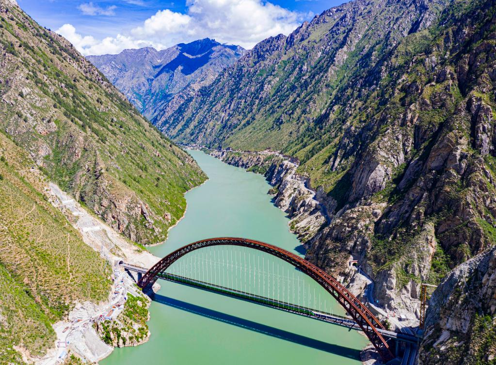 ——藏木雅魯藏布江雙線特大橋位于西藏山南市加查縣境內(nèi),全長525.1米、主拱跨徑430米,耐候鋼選材、管內(nèi)混凝土配制、橋梁設(shè)計與施工等建設(shè)關(guān)鍵技術(shù)突破了世界性難題。記者近日看到,大橋橫跨于碧綠的雅江,兩端接連隧道,氣勢宏大壯觀。