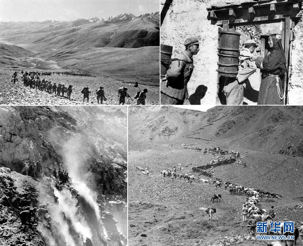 這是一張拼版照片:左上圖為1950年,人民解放軍戰(zhàn)士跋涉在高山峻嶺間向西藏前進(jìn)(資料照片);右上圖為人民解放軍戰(zhàn)士在執(zhí)勤空隙為藏族老百姓背水(資料照片,張正模攝);左下圖為筑路戰(zhàn)士在懸崖絕壁上修建川藏公路(資料照片);右下圖為1951年7月,解放軍第十八軍進(jìn)藏先遣部隊行進(jìn)在瓦合山上(新華社記者袁克忠攝)。新華社發(fā)