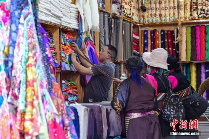 拉薩老城區(qū)的八廓街上,花樣繁多的藏裝店構(gòu)成一道絢爛民族風。店中選購藏裝的顧客,既有本地人,也不乏口音各異的外地游客。22日下午,在此經(jīng)營藏裝店10余年的卓瑪迎來“特殊”的客人。