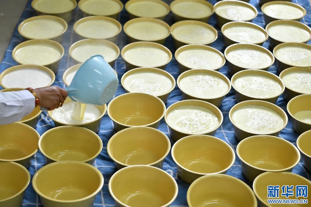西藏娘亞牦牛養(yǎng)殖產(chǎn)業(yè)發(fā)展有限責(zé)任公司的員工在制作傳統(tǒng)手工酸奶(7月28日攝)。新華社記者 李鑫 攝