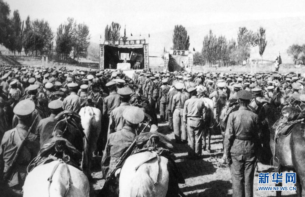 獨(dú)立騎兵師一團(tuán)在新疆于田縣普魯村召開進(jìn)藏誓師大會(huì)(資料照片)。新華社發(fā)(進(jìn)藏英雄先遣連紀(jì)念館供圖)
