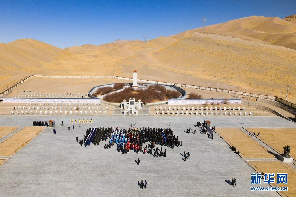 清明時(shí)節(jié),西藏阿里的黨員干部、解放軍、學(xué)生及群眾,聚集獅泉河烈士陵園,祭奠英靈(2021年4月4日攝,無人機(jī)照片)。新華社記者 張兆基 攝