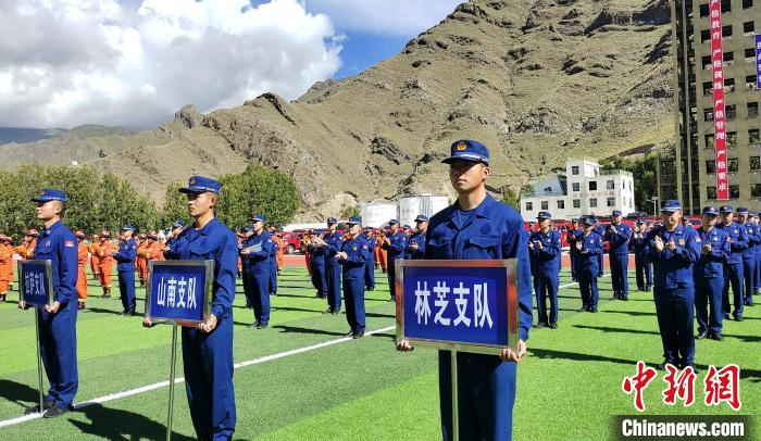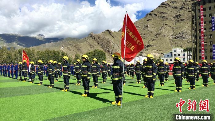 圖為西藏自治區(qū)消防救援總隊7個支隊代表參加配發(fā)儀式。貢桑拉姆 攝