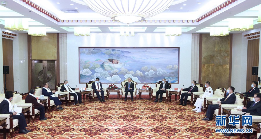 8月18日,以中共中央政治局常委、全國政協(xié)主席汪洋為團(tuán)長的中央代表團(tuán)飛抵拉薩,出席西藏和平解放70周年慶?;顒?。受黨中央和習(xí)近平總書記委托,汪洋在拉薩飯店看望在藏領(lǐng)導(dǎo)干部、老同志白瑪赤林、帕巴拉·格列朗杰和列確、巴桑,以及阿沛·阿旺晉美同志家人代表,向他們表示親切問候。新華社記者 劉彬 攝