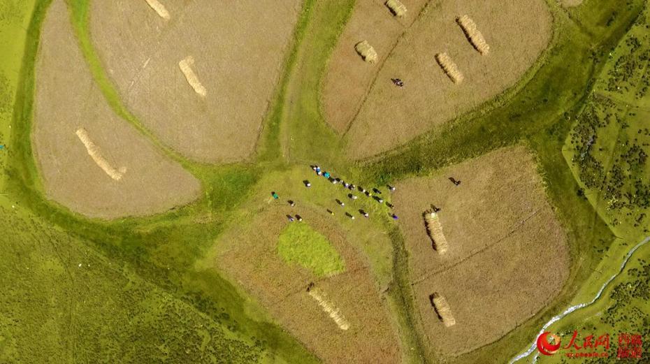 九月的西藏,已進(jìn)入青稞成熟收割時節(jié)。記者來到拉薩市曲水縣熱堆村,成片成片成熟了的青稞,金黃耀眼。村民們抓緊天氣晴好的時機,互幫互助忙收割,確保顆粒歸倉。地頭田間,有的已被割倒束成捆,也有的仍在迎風(fēng)搖曳,等待收割,村民們揮舞著鐮刀,將成熟的青稞收割、扎捆、然后堆砌成一排排整齊的青稞垛子,用拖拉機將青稞運回家,再上架晾曬,看著沉甸甸的麥穗,聞著空氣中彌漫著沁人心脾的青稞香,村民們臉上露出了喜悅的微笑。無人機鳥瞰青稞田地。人民網(wǎng) 次仁羅布攝