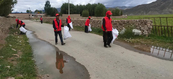 穿紅色馬甲的志愿者維護村容村貌。 圖由拉孜縣宣傳部提供