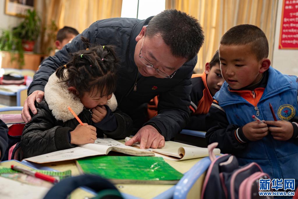 援藏教師潘杰和藏族學生在一起(12月12日攝)。