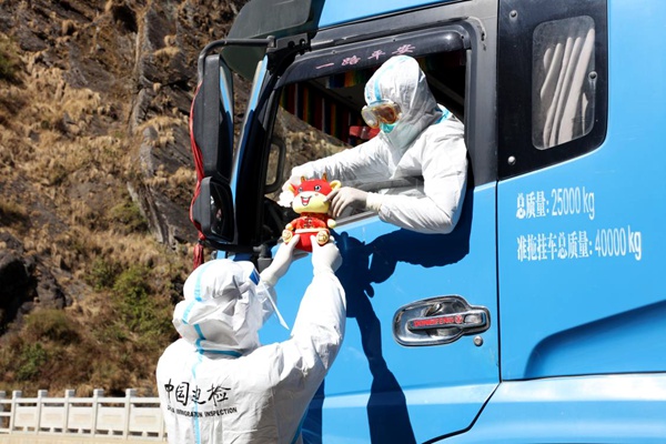 聶拉木邊檢站移民警察為貨車(chē)司機(jī)送新年禮物。李東洪攝