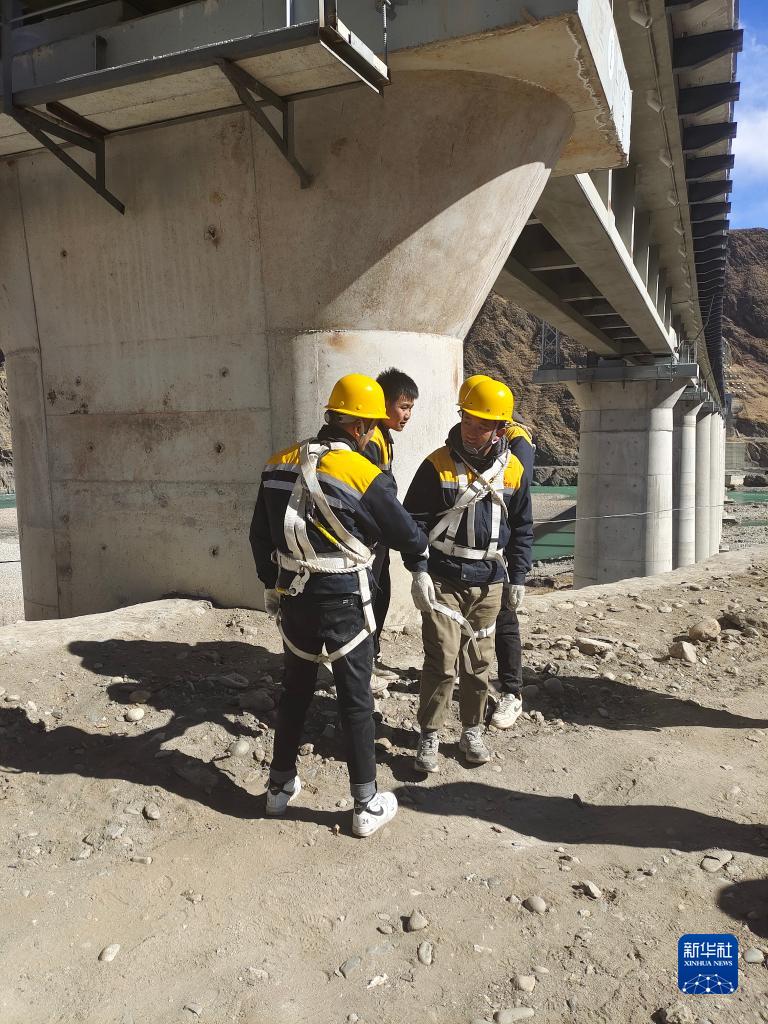 冷達2號雅魯藏布江特大橋橫跨雅魯藏布江?!?0后”橋隧工趙浩澤穿著亮黃色安全馬甲,系好安全帶,開始檢查抗震樁、支座和支撐墊石的情況。