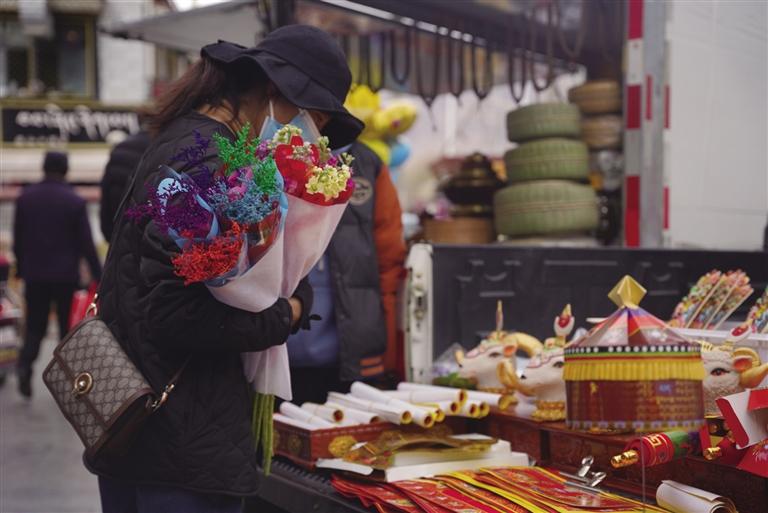 千門萬戶曈曈日,總把新桃換舊符。隨著各民族交往交流交融,藏文對聯(lián)也逐漸成為藏歷新年年貨市場中不可缺少的“成員”,寄托了人們對來年美好生活的殷切期盼。走進(jìn)沖賽康市場,記者看到很多攤位都擺放著各式各樣紅色藏式對聯(lián),內(nèi)容主要蘊(yùn)含平安、健康、長壽等吉祥的寓意,不時還有市民前來詢價選購。此外,每年藏歷新年前,不少書法家還會將滿載祝福的對聯(lián)寫好后送給市民,把濃濃的年味和對藏歷新年的祝福送到大家手中。