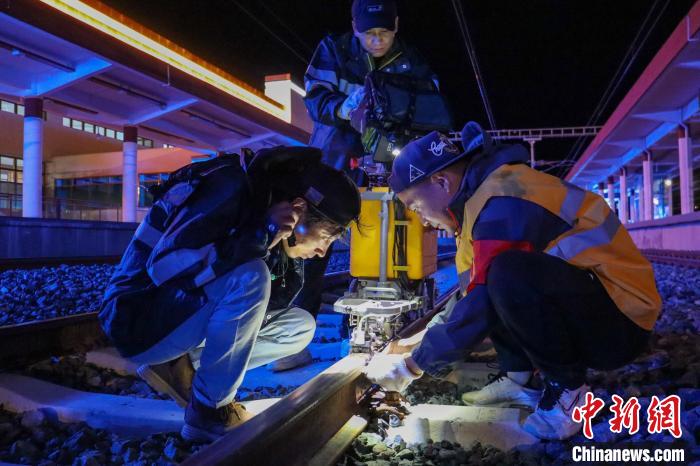 工人夜間對拉林鐵路鋼軌進行病害檢測?!±痛稳?攝