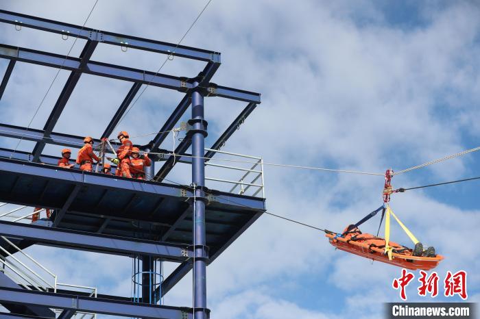 圖為消防指戰(zhàn)員利用橫渡系統(tǒng)轉(zhuǎn)運(yùn)傷員。 林芝市森林消防支隊(duì) 攝