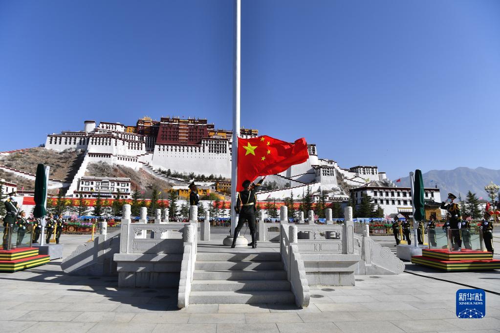 上午10時(shí),隨著《義勇軍進(jìn)行曲》的響起,五星紅旗在布達(dá)拉宮廣場迎風(fēng)飄揚(yáng)。大家肅穆而立,向著國旗行注目禮。
