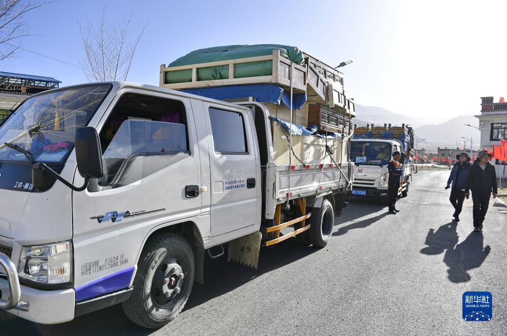 為搬遷群眾運送家具的車輛駛?cè)胂婧铀畮煲泼裥麓澹?月27日攝)。新華社記者 張汝鋒 攝