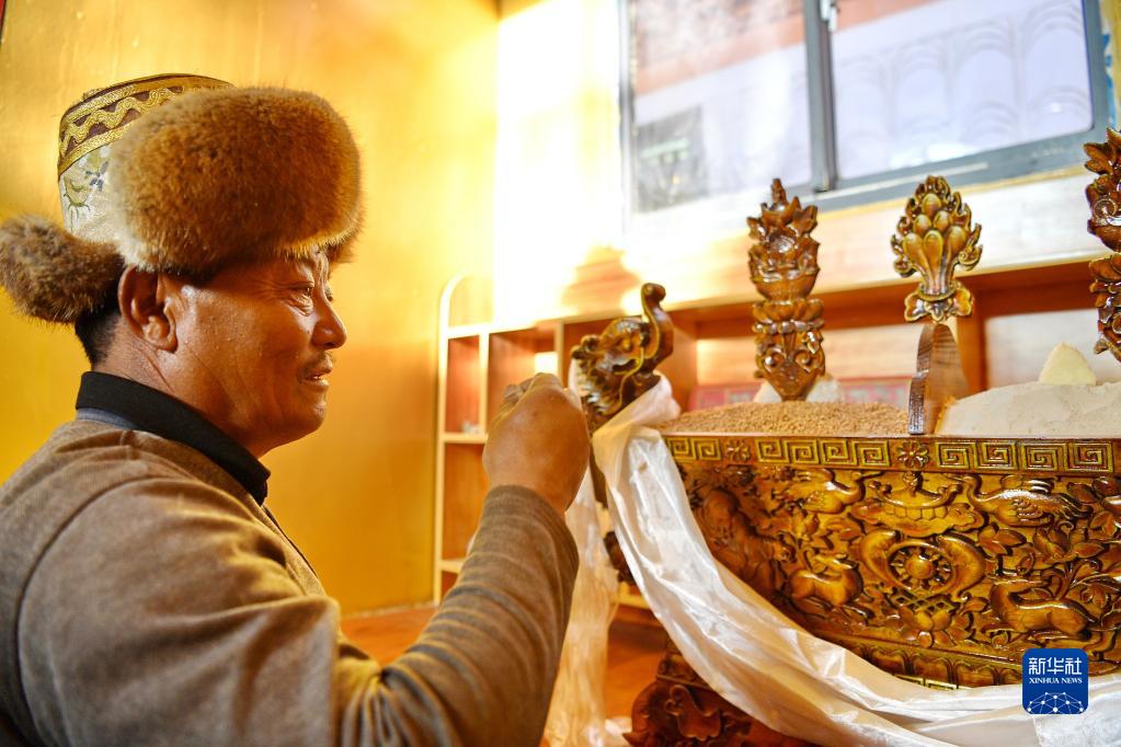 在湘河水庫移民新村,搬遷群眾羅布占堆在新家的切瑪盒前祈福(3月27日攝)。新華社記者 張汝鋒 攝