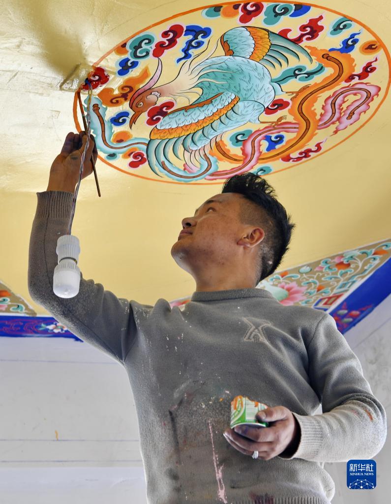 來自日喀則的民間藝人在湘河水庫移民新村一處民居繪制屋頂(3月27日攝)。新華社記者 張汝鋒 攝