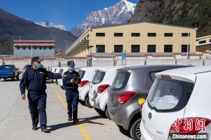 圖為拉薩海關(guān)關(guān)員在吉隆口岸出口貨物查驗場監(jiān)管出口國產(chǎn)電動車。資料圖 拉薩海關(guān)供圖