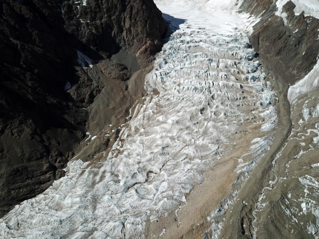 2022年3月27日拍攝的窮母崗日峰腳下的冰川。(無人機照片,新華社記者 姜帆 攝)