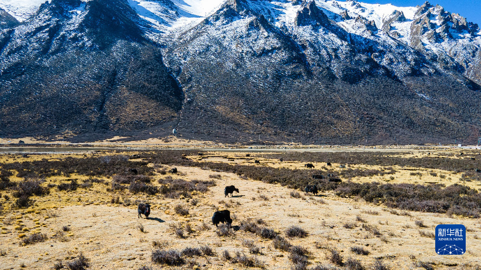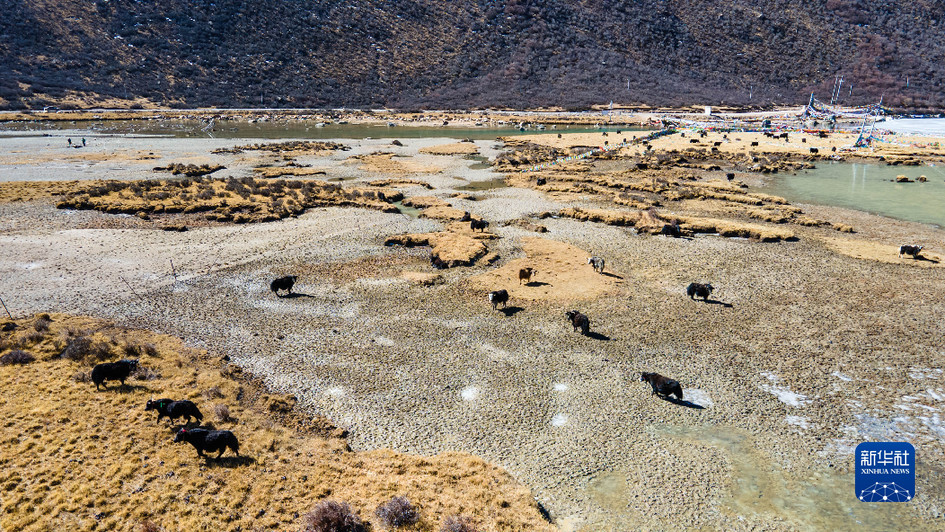 西藏娘亞牦牛養(yǎng)殖產(chǎn)業(yè)發(fā)展有限責(zé)任公司的牦牛在牧場上活動(3月30日攝,無人機照片)。新華社記者 周荻瀟 攝