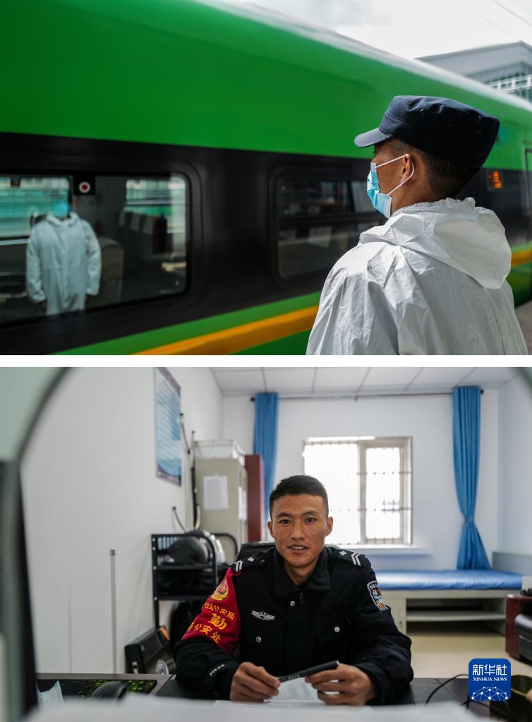 拼版照片:上圖為3月31日,白瑪旺扎在列車即將駛離車站時執(zhí)勤(新華社記者洛卓嘉措攝);下圖為白瑪旺扎在派出所接待窗口(新華社記者劉潁攝)。今年24歲的白瑪旺扎2021年8月起在林芝站派出所擔任輔警,他的家位于離車站3公里的麥巴村。鐵路的開通讓他解決了就業(yè),同時還能照顧家庭。新華社發(fā)