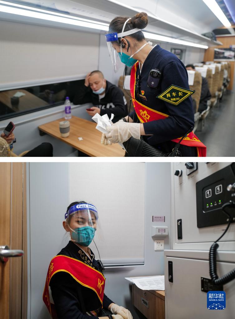 拼版照片:上圖為3月27日,劉文靜在列車上檢查衛(wèi)生;下圖為劉文靜在列車廣播室。C893次列車長劉文靜已經(jīng)在鐵路工作近十年,先后在青藏、拉日、拉林三條鐵路線任職,親身經(jīng)歷十年來西藏鐵路運輸?shù)木拮儭P氯A社記者 洛卓嘉措 攝