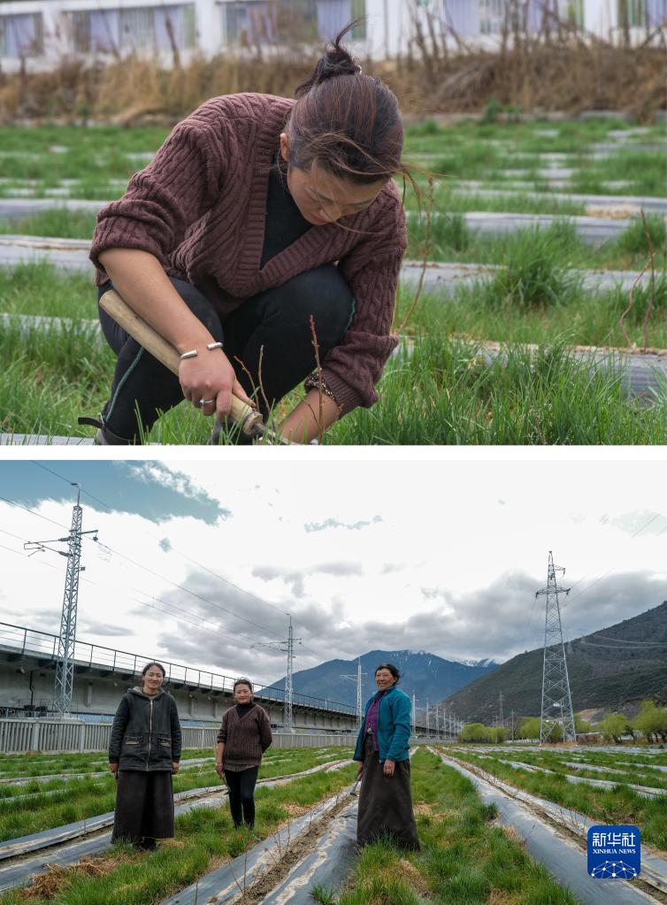 拼版照片:上圖為3月30日,尼瑪?shù)录谒{莓種植基地工作;下圖為尼瑪?shù)录ㄖ校┘巴抡驹谒{莓種植基地中,背后是鐵路橋。麥巴村村民尼瑪?shù)录衲陝倽M20歲,此前在林芝巴宜區(qū)一家藏餐館打工,后來回到村里設立的藍莓種植基地工作。尼瑪?shù)录f,能在家門口工作令她很開心,她每天都能看到火車從旁邊經(jīng)過,希望有一天也能坐上火車去拉薩逛一逛。新華社記者 洛卓嘉措 攝
