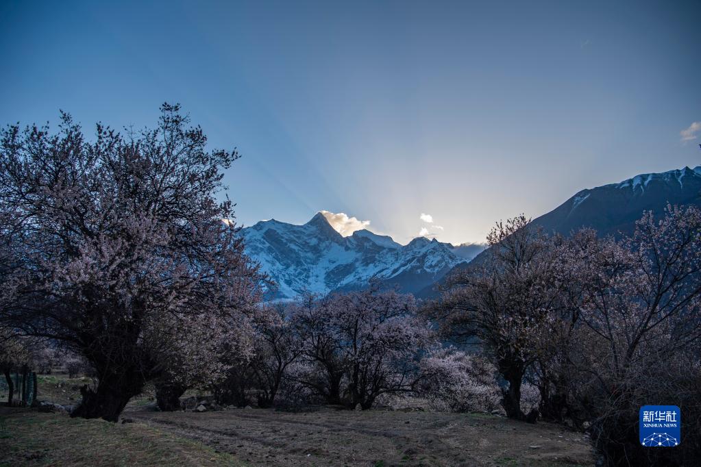 桃花掩映下的南迦巴瓦峰(4月13日攝)。新華社記者 晉美多吉 攝