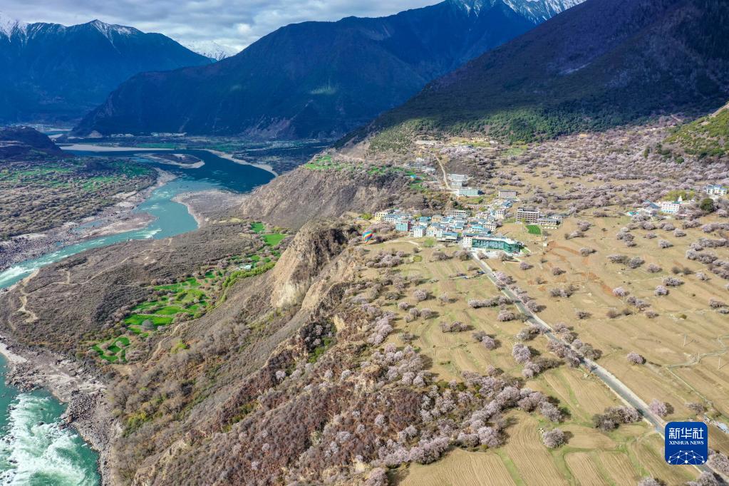 這是無人機拍攝的索松村,村子腳下是蜿蜒的雅魯藏布江(4月13日攝)。新華社記者 孫非 攝