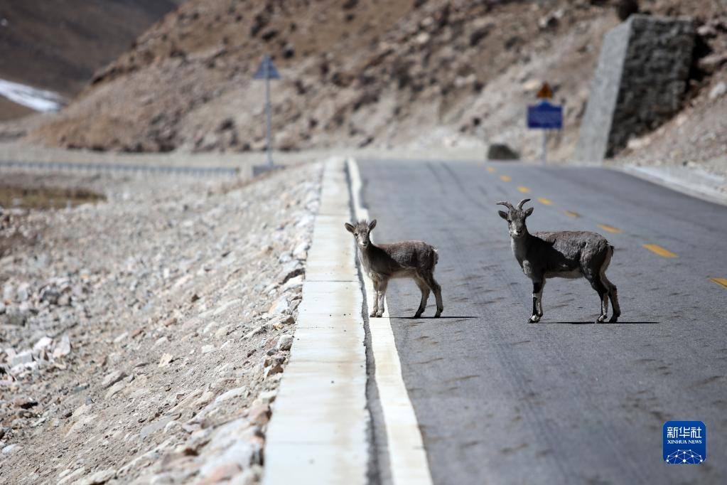 兩只巖羊在拉薩市當(dāng)雄縣的鄉(xiāng)村道路上(3月27日攝)。新華社記者 姜帆 攝