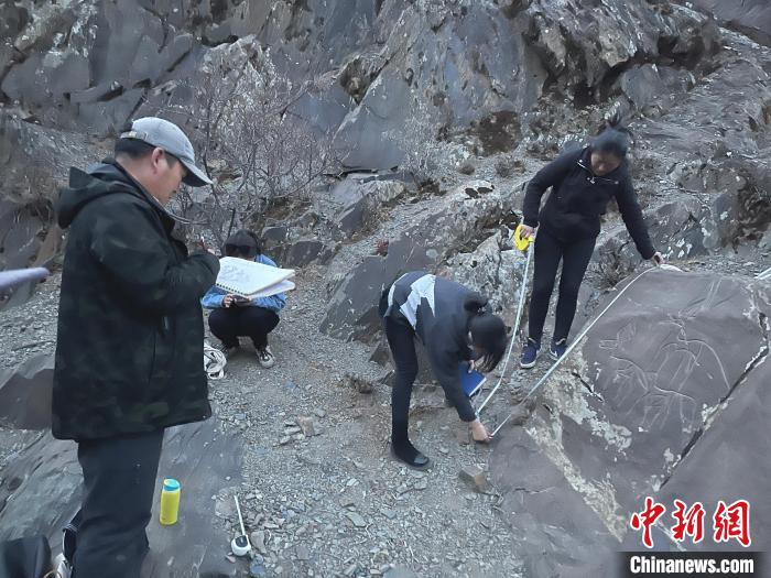 圖為日喀則石刻藝術(shù)博物館工作人員測量巖畫尺寸。日喀則石刻藝術(shù)博物館供圖
